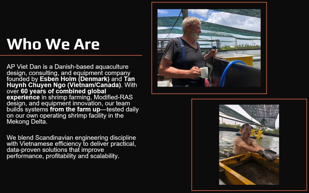 History and experience have brought us here, offering a hybrid (probiotics-light) modified-RAS design, equipment innovation, building systems from the farm up—tested daily on our own operating shrimp facility in the Mekong Delta.