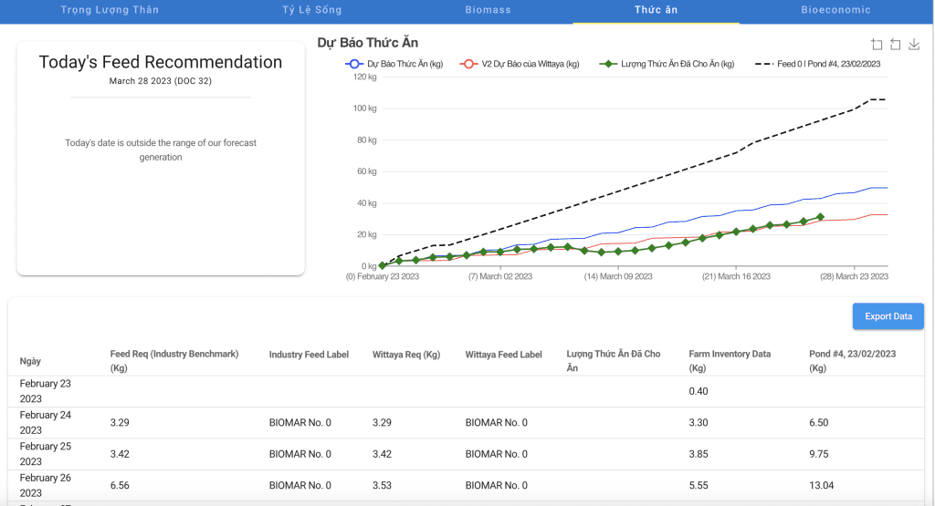 Đánh giá việc thực hành cho ăn. Tạo bảng dự báo thức ăn cụ thể thích ứng với điều kiện nuôi và loại thức ăn sẵn có bằng ứng dụng phần mềm tiên tiến từ Canada AquaOp Farm.